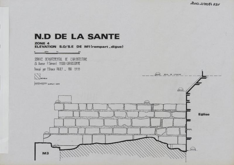 Fouilles jouxtant l'édifice ; rempart digue élévation sud-ouest et sud-est ; zone 4.
