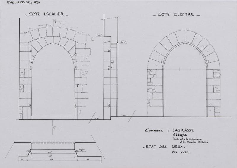 Porte d'accès du cloître ; état des lieux élévations côté escalier, côté cloître ; plan vu du dessus.