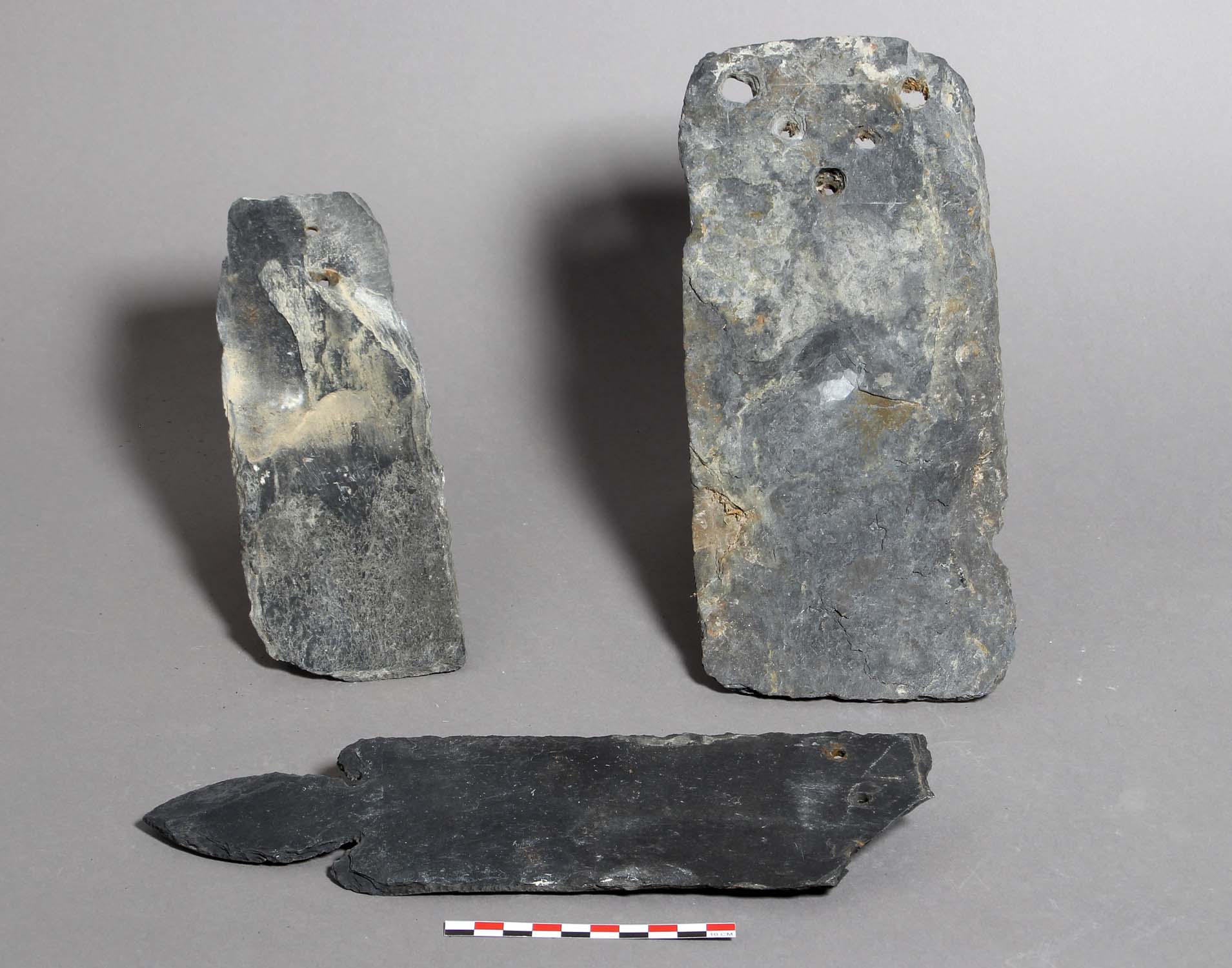 POP | Plateforme ouverte du patrimoineArdoise d’Angers ; au premier plan : taillée en lancette ; à l’arrière, à gauche : percée d’un trou ; à droite : percée de 5 trous