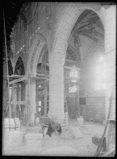 Intérieur en cours de restauration : pierres déposées, échafaudages