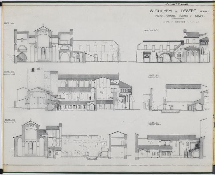 Coupes et élévations AA, BB, CC, DD et EE. Eglise, vestiges cloître et abbaye.