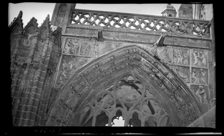 Porche d’entrée : sculptures et bas-reliefs à contre-jour