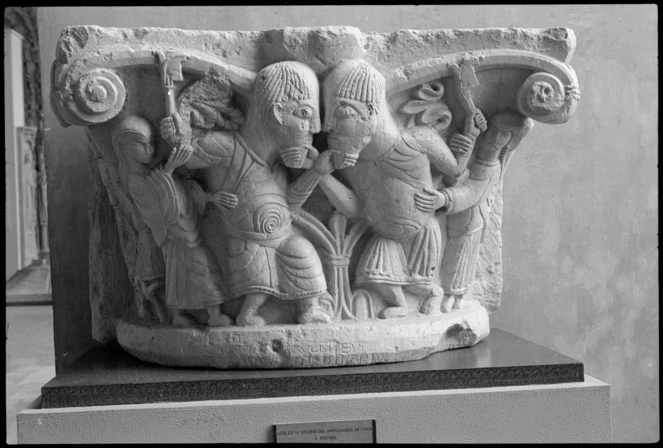Chapiteau : deux vieillards se tenant par la barbe, Poitiers, église Saint-Hilaire