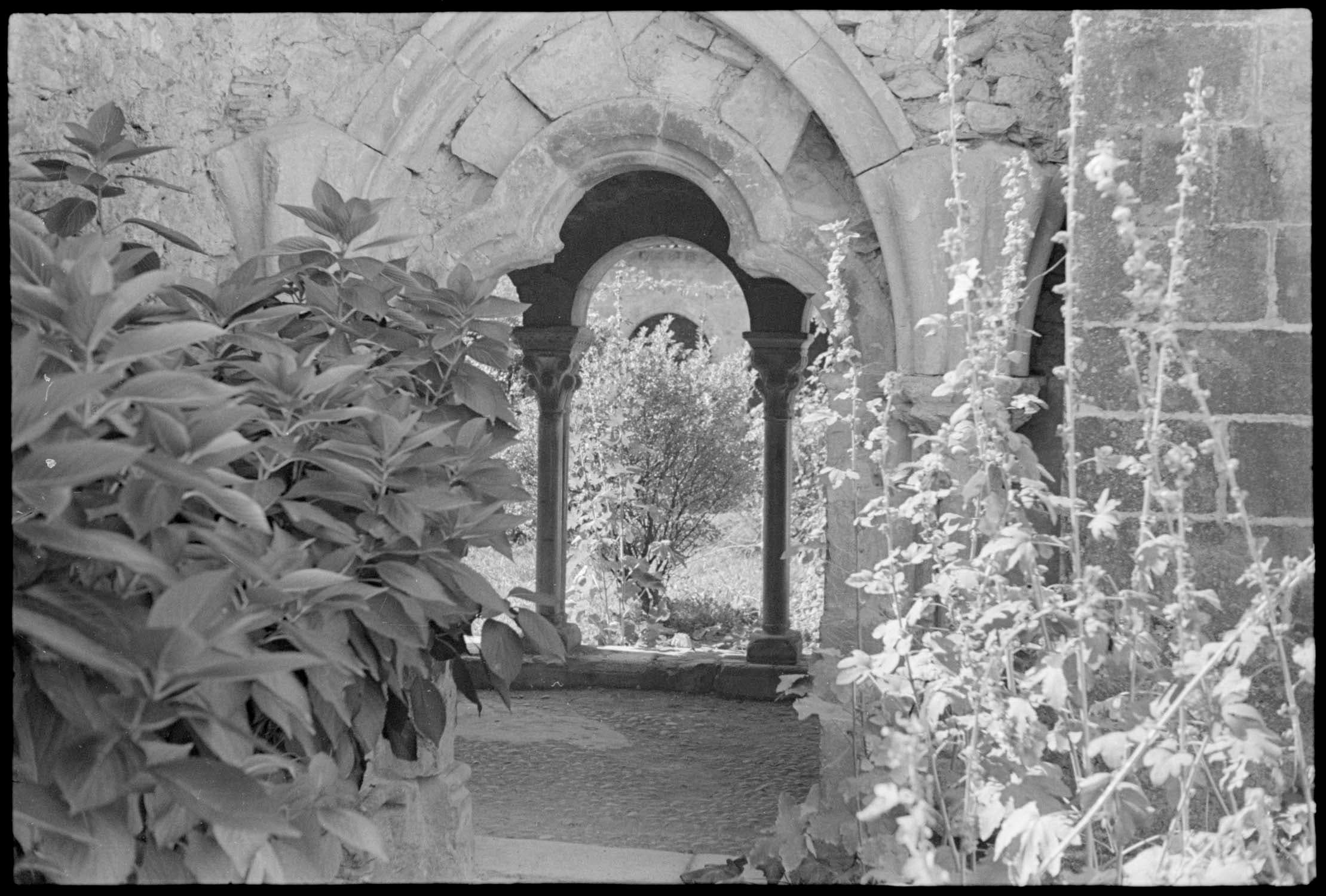 POP | Plateforme ouverte du patrimoineCloître : allée fleurie vue entre deux colonnes jumelles