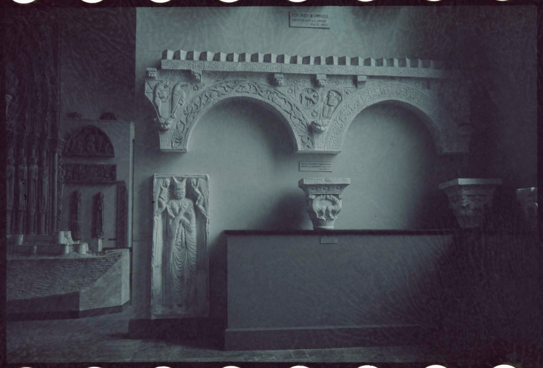 Moulage : pierre tombale, Elne, église Sainte-Eulalie ; Moulage : chapiteaux, Saint-Jacques-de-Compostelle, abside