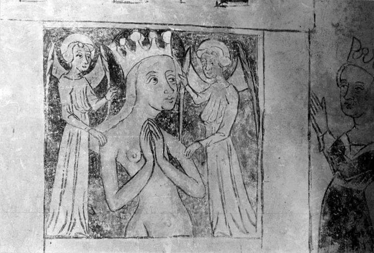 peinture monumentale, vie de saint Catherine, 15e siècle, détail de la sainte nue entourée par des anges