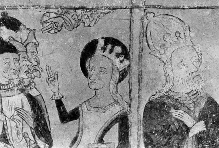 peinture monumentale, vie de saint Catherine, 15e siècle, détail de la sainte montrant la main de Dieu sortant des nuées à un groupe de personnages