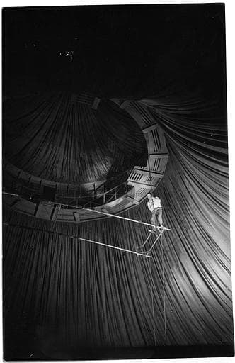 Luciano Albertini jouant Silvio Spaventa sur un trapèze sous chapiteau