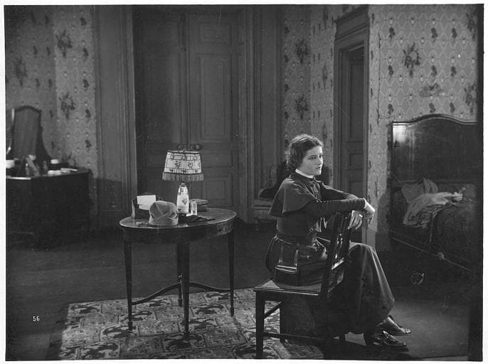 Marie Glory (alias Arlette Genny) dans le rôle de Miss Helyett assise les bras appuyés sur le dossier de sa chaise dans une chambre