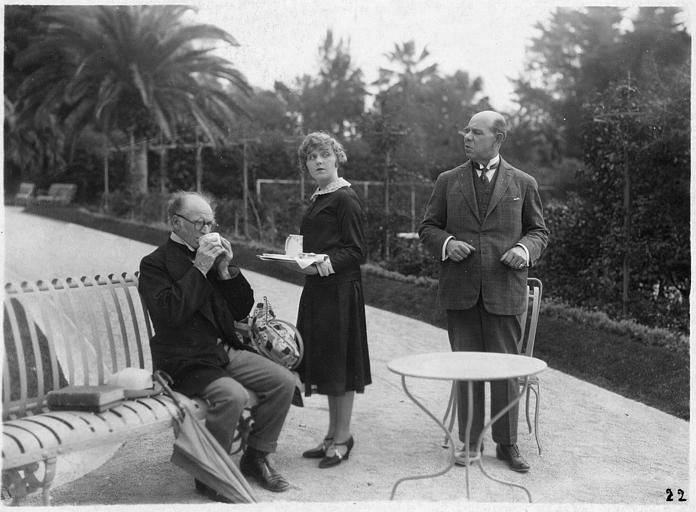 POP | Plateforme ouverte du patrimoineFred Wright est assis sur un banc pour boire le verre que lui a apporté Betty Balfour, tandis que Louis Baron le regarde