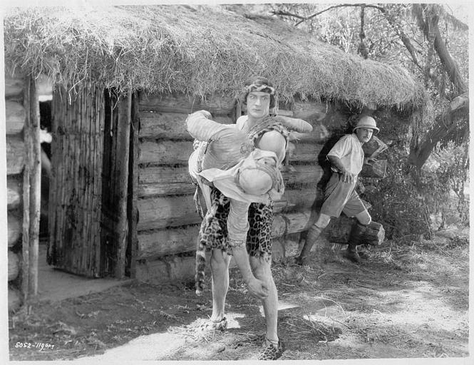 POP | Plateforme ouverte du patrimoineFranck Merril dans le rôle de Tarzan portant un homme à l'entrée d'une cabane tandis qu'un autre s'enfuit