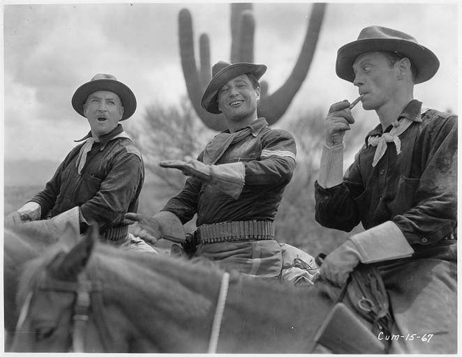 POP | Plateforme ouverte du patrimoineEdmund Lowe dans le rôle du sergent Mickey Dunn, Frederic Burt dans celui du sheriff Tex Ransom et James Bradbury Jr qui joue Dixon, chevauchent côte à côte dans le désert : dans 'The Cisco Kid' (Fox Picture)