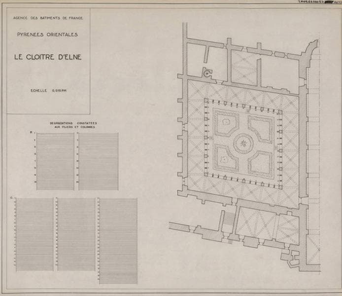 Cloître, plan, dégradations constatées aux piliers et aux colonnes suite maladie du marbre.