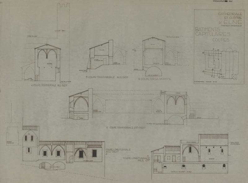 Bâtiments capitulaires : coupe transversale est-ouest, coupe longitudinale aile ouest, coupe longitudinale aile est, coupe transversale aile ouest, coupe transversale aile est, coupe sur la sacristie.