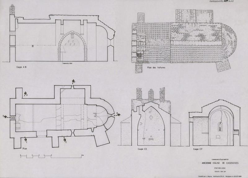 Etat des lieux : plans général et des toitures ; coupes AB, CD et EF.
