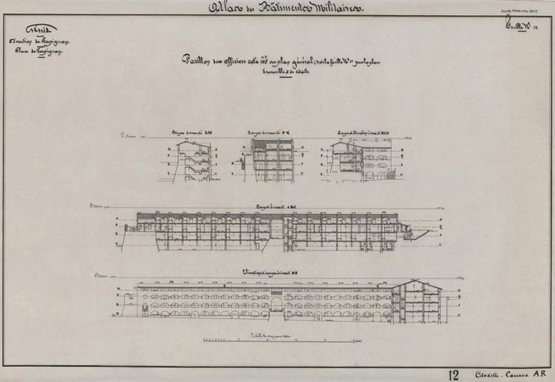 Elévations et coupes ; réédité à l'agence des Bâtiments de France d'après la feuille n°12 de l'Atlas des Bâtiments militaires 1821.