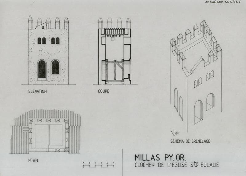 Clocher : élévation, plan, coupe, schéma de crénelage.