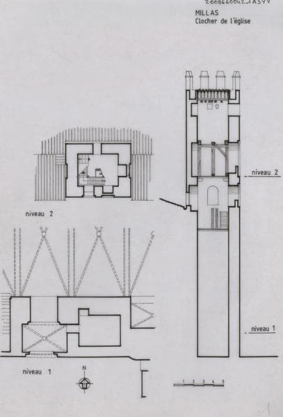 Clocher : plans niveaux 1 et 2, coupe.
