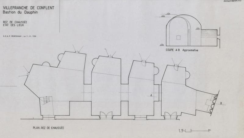 Bastion du Dauphin ; état des lieux : plan rez-de-chaussée, coupe approximative.