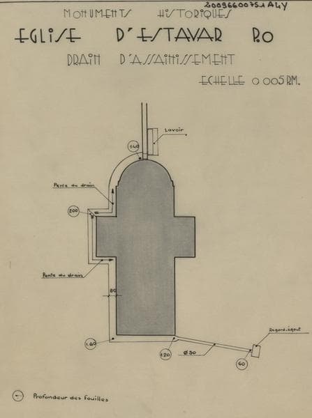 Plan de masse avec cotes des profondeurs des fouilles et relevé du drain d'assainissement.