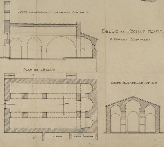 Plan général, coupes transversale et longitudinale sur la nef centrale.