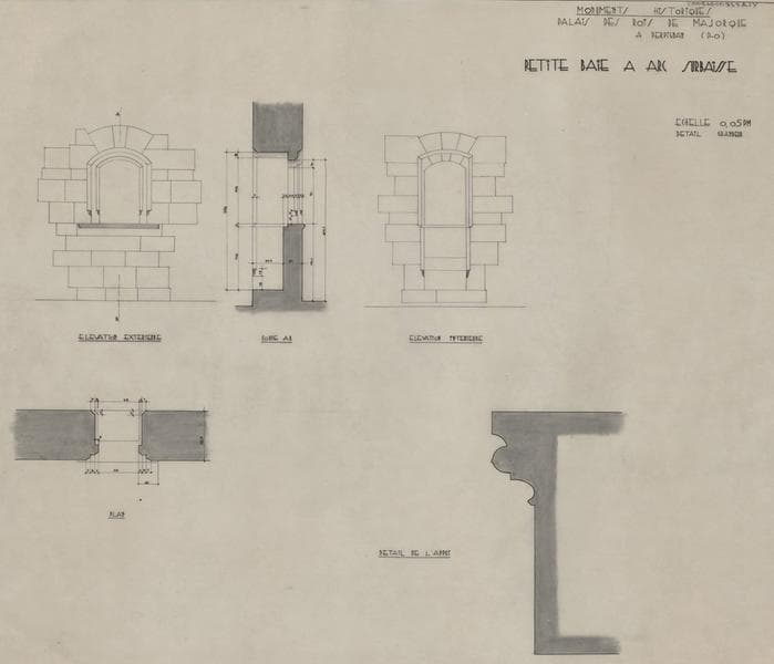 Palais des Rois de Majorque ; chapelle haute ; petite baie à arc surbaissé : plan vue de dessus, détail de l'appui, élévations extérieure et intérieure, coupe AB.