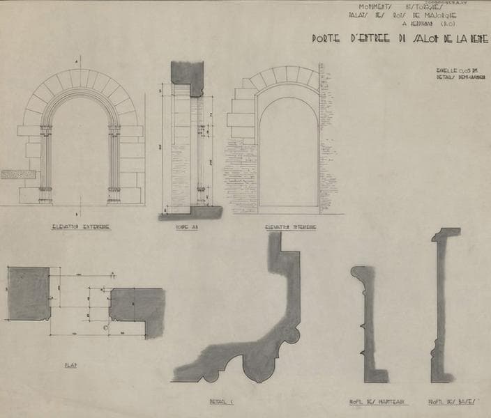 Palais des Rois de Majorque ; chapelle haute ; petite baie à arc surbaissé : plan vue de dessus, détail de l'appui, élévations extérieure et intérieure, coupe AB.