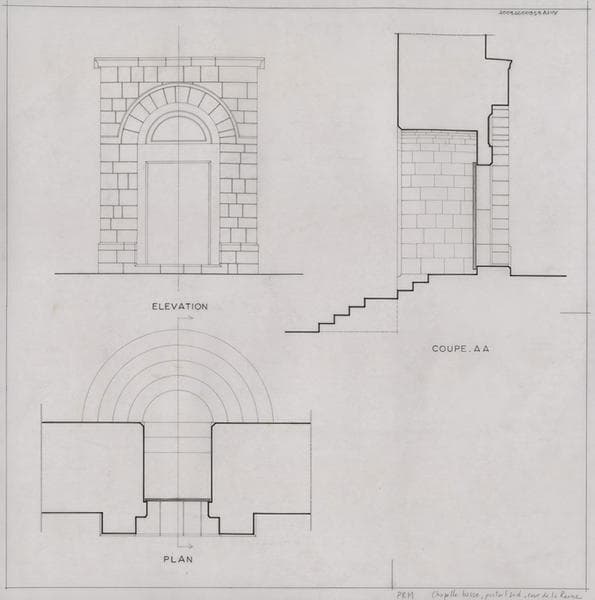 Palais des Rois de Majorque ; chapelle basse ; portail sud donnant sur la cour de la Reine : plan au sol, élévation et coupe AA.
