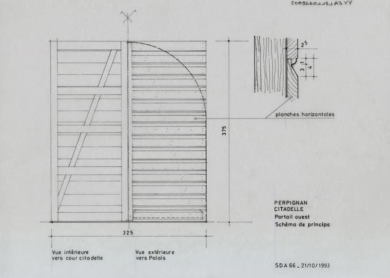 Citadelle ; portail ouest : schéma de principe ; élévations cotées intérieure et extérieure ; coupe des planches horizontales.