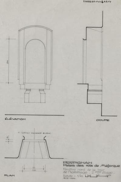 Palais des Rois de Majorque ; fenêtre nord de la tour de l'hommage ; 2 ème étage : plan, élévation et coupe.