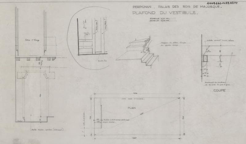 Palais des Rois de Majorque ; plafond du vestibule : coupes embrasures des portes de l'entresol et du 1er étage ; vue axonométrique des escaliers ; plan ; coupe sur poutre.