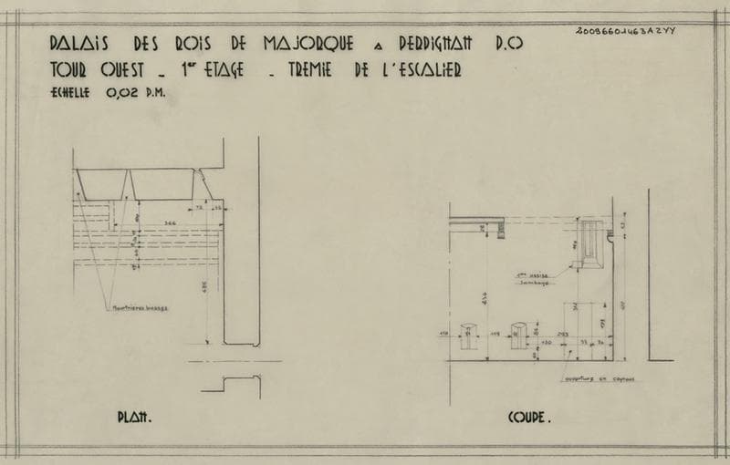 Palais des Rois de Majorque ; tour Ouest ; 1er étage ; trémie de l'escalier : plan et coupe.