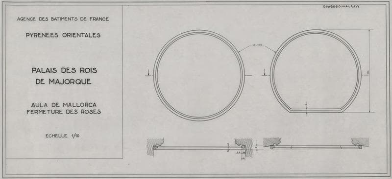 Palais des Rois de Majorque ; salle Mallorca ; fermetures des roses : plans et élévations Est et Ouest, le tout coté.