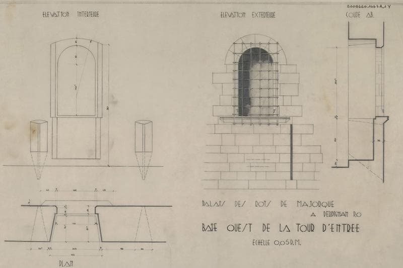 Palais des Rois de Majorque ; coté Ouest : plan, élévations intérieure et extérieure, coupe.