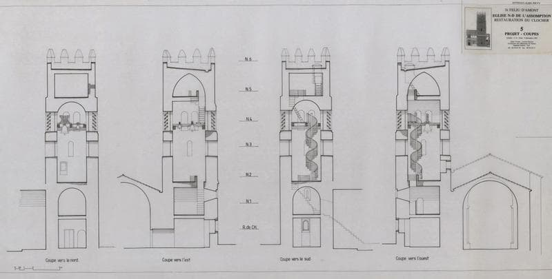 Restauration du clocher ; projet : coupes vers vers le nord, vers l'est, vers le sud et vers l'ouest.