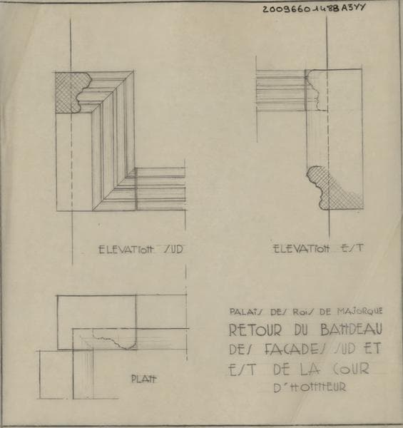 Palais des Rois de Majorque ; façades Sud et Est de la cour ; retour du bandeau : plan, élévation Sud et élévation est.