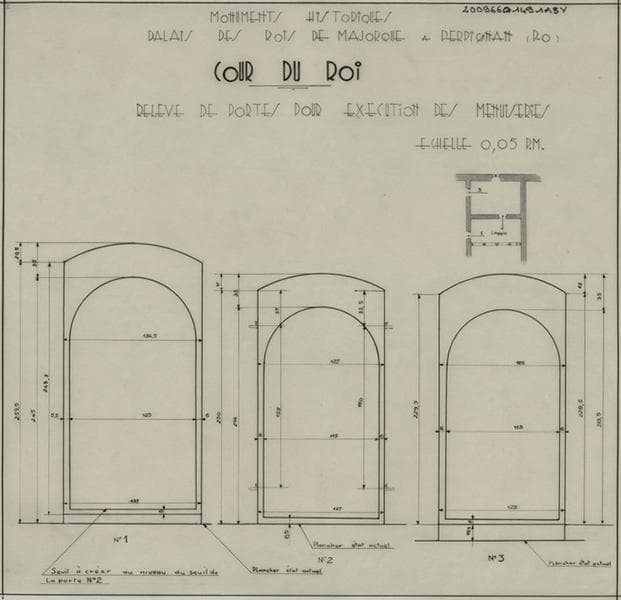 Palais des Rois de Majorque ; cour du Roi ; portes : plan de situation ; relevé coté pour exécution des menuiseries.