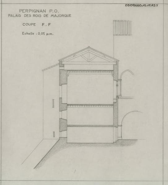 Palais des Rois de Majorque ; cour de la Reine ; façade Ouest du logis Est avec une partie de la jonction avec la façade du logis méridional : coupe transversale.