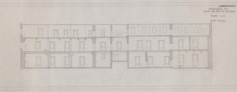 Palais des Rois de Majorque ; aile Nord : coupe longitudinale EF.