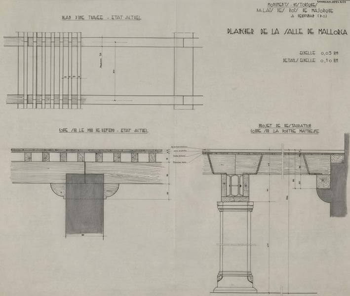 Palais des Rois de Majorque ; Salle Mallorca ; plancher : coupe sur le mur de refend, état actuel éch. 1/20 ; projet de restauration, coupe cotée sur la poutre maîtresse.