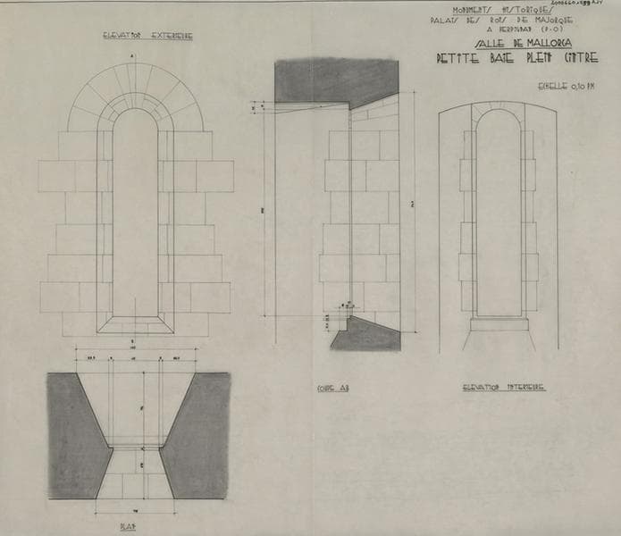 Palais des Rois de Majorque ; Salle de Mallorca ; petite baie plein cintre : plan, élévations extérieure et intérieure ; coupe AB ; le tout coté.