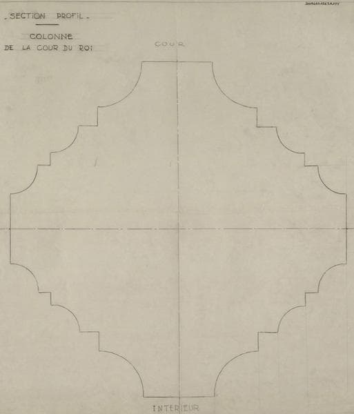 Palais des Rois de Majorque ; colonne de la cour du Roi : vu de dessus avec localisation des cotés intérieur et cour.