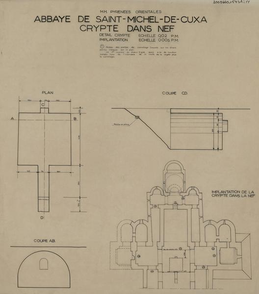 Crypte dans la nef ; détail crypte ; implantation : coupe AB ; plan coté ; plan général avec localisation de la crypte dans la nef ; coupe