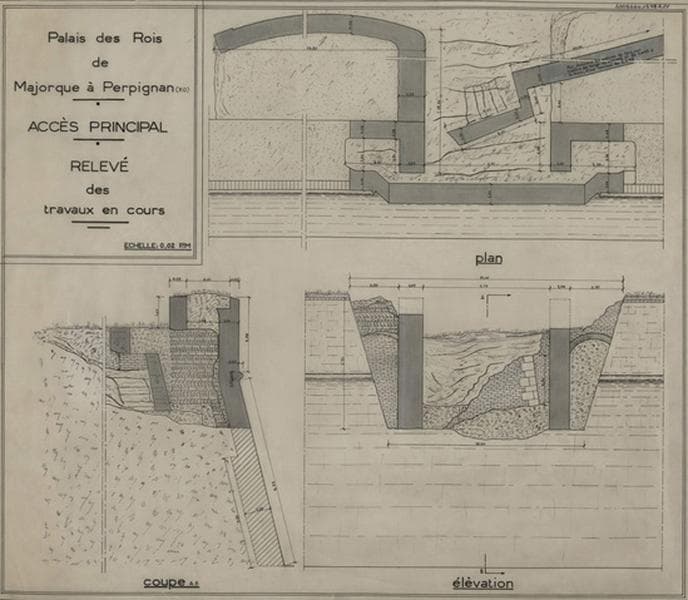Palais des Rois de Majorque ; accès principal ; relevé des travaux en cours.