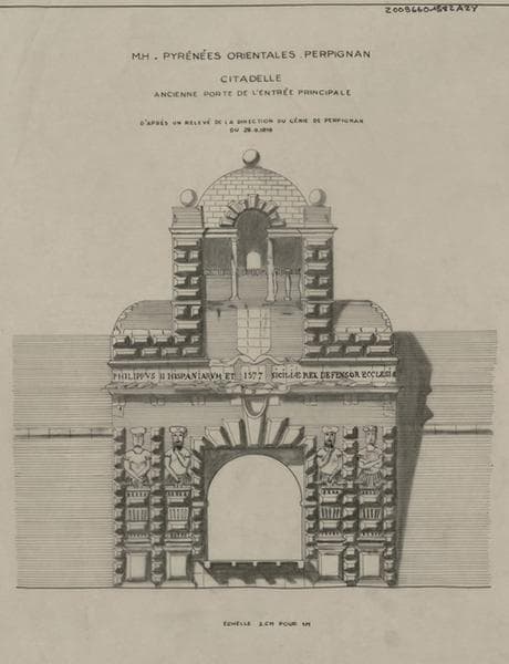 Citadelle ; ancienne porte de l'entrée principale dessiné à l'Agence des Bâtiments de France d'après un relevé de la Direction du Génie de Perpignan du 28 septembre 1818.