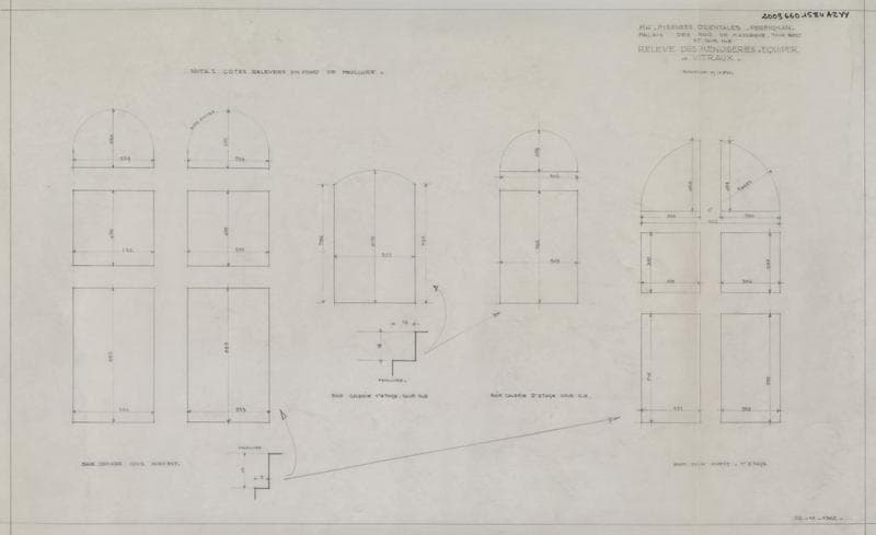 Palais des Rois de Majorque ; relevé des menuiseries à équiper des vitraux : élévations baie géminée cour ; celle du premier et 2ème étage ; cour nord-est : élévation tour Ouest, 1er étage ; plan ; le tout coté.