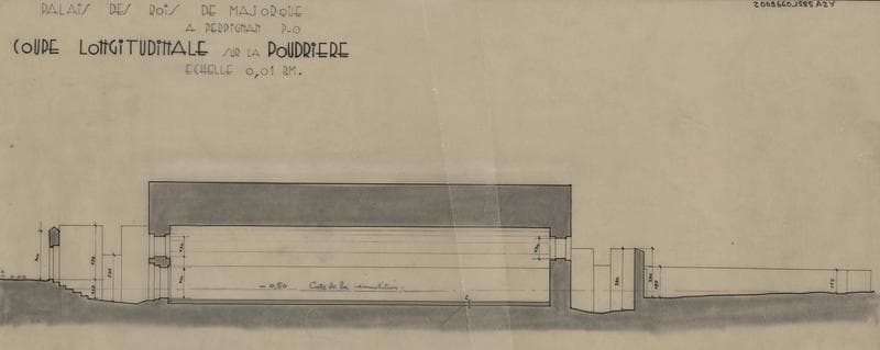 Palais des Rois de Majorque : coupe longitudinale sur la poudrière cotée.