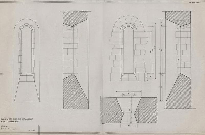 Palais des Rois de Majorque ; façade Ouest ; baie : élévations intérieure et extérieure, coupes de chaque coté et plan.