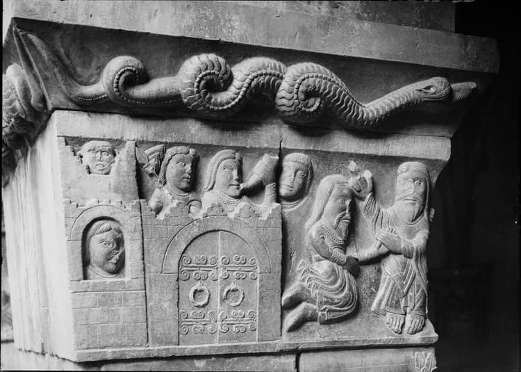 POP | Plateforme ouverte du patrimoineCloître, chapiteau orné d’une scène de la vie de saint Pierre : Domine quo vadis