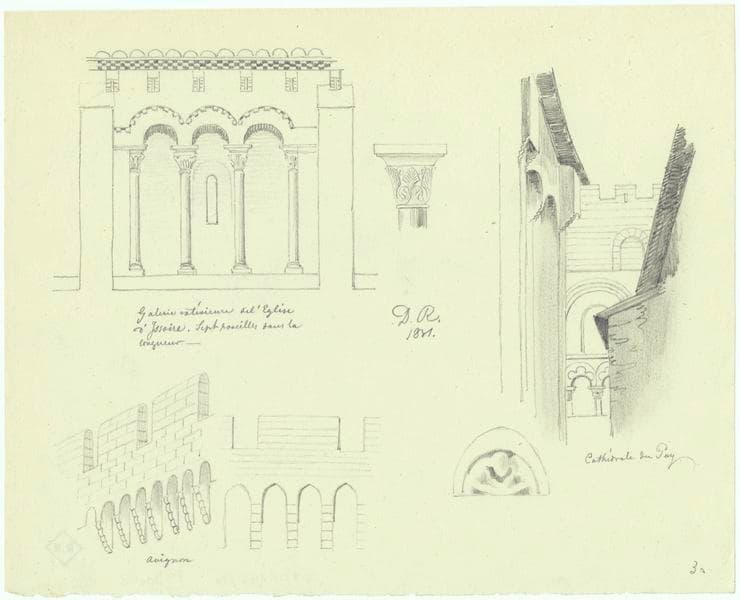 2 autres croquis : rempart d'Avignon et bâtiment des machicoulis de la cathédrale du Puy-en-Velay